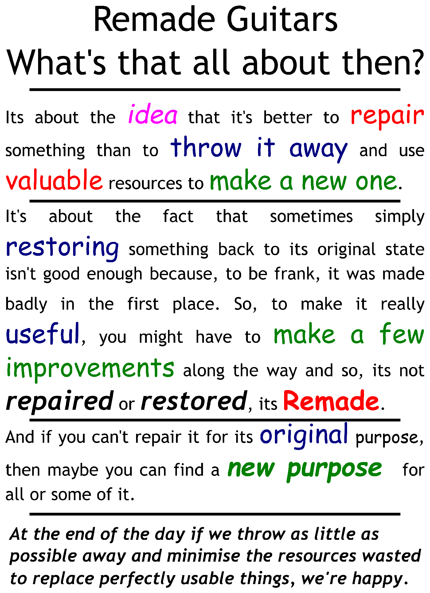 Back when we opened in 2010 it wasn't unusual to be asked what, exactly, Remade Guitars meant. These days it doesn't happen quite so often but in case you're wondering, here's a copy of the writing on the wall in our original shop that made answering that question easier and still informs every 'business' decision we make.